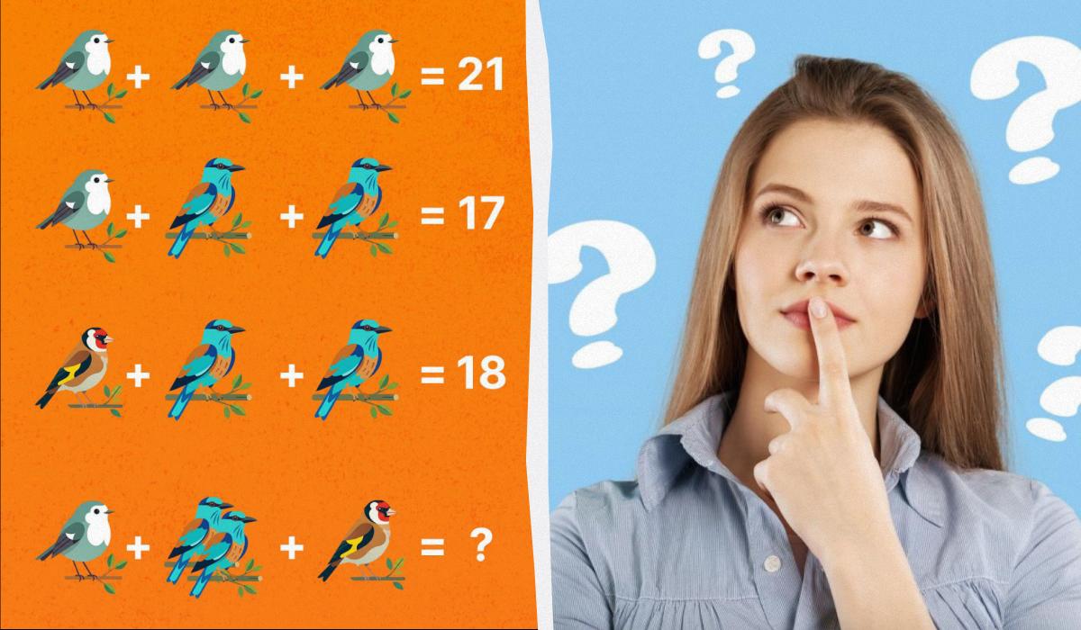 Als je goed naar de afbeelding kijkt, zie je dat drie grijsgroene vogels een totaal van 21 geven. Tegelijkertijd is één zo’n vogel en twee met een turquoise verenkleed gelijk aan 17 enzovoort. En de som van twee turquoise vogels en één bruine vogel is gelijk aan 18.